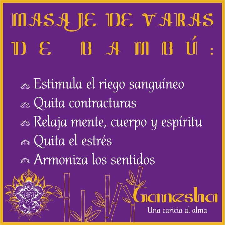 Este tipo de masaje es muy recomendable para personas que tienen constante dolor en piernas o espalda por faltas el la circulación, ya que la barras de bambú estimulan el riego sanguíneo, alivia y disminuye considerablemente el dolor por contracturas, reduce el estrés ayuda con la armonización de sentidos permitiendo estar rn el aquí y ahora más atento al presente de una forma en la que se está regalando mente cuerpo y espíritu.